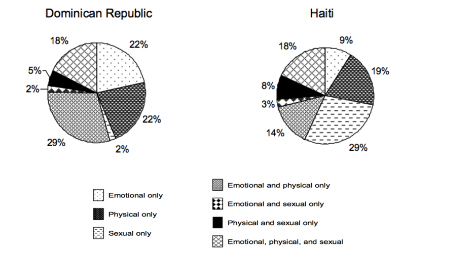 Gen lòt etid ki montre ke nivo vyolans sa a pi wo toujou nan kèk kategori moun nan popilasyon an. Demographic and Health Services (DHS) te evalye ke 29% fanm marye viktim vyolans seksyèl Ayiti konpare ak 2% an Dominikani.