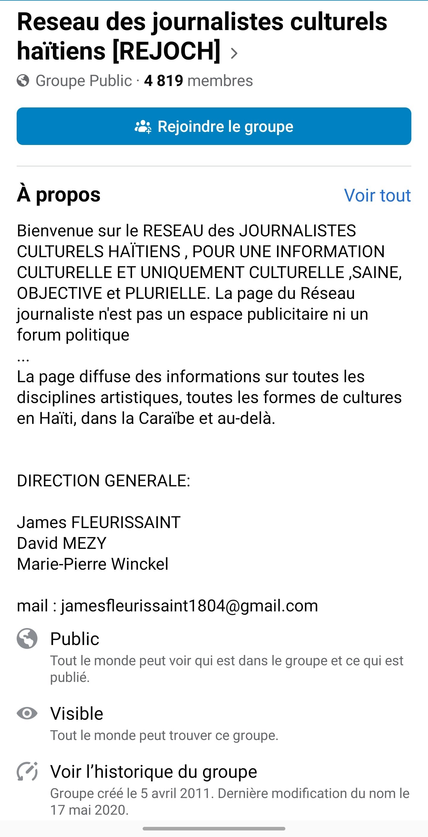 J’ai commencé par m’enquérir de ce réseau de journalistes pour découvrir qu’il s’agit d’un groupe Facebook de 4000 âmes créé en 2011 dont le nom a été changé en mai de cette année. Sans plus. Pas de site web. Pas même de page Facebook. Un groupe dont le nom a récemment changé et dont la direction générale est assumée par 3 individus vivant à l’étranger : l’homme de théâtre James Fleurissaint (Sarcelles, France), le metteur en scène David Mezy (Montréal, Canada) et la syndicaliste Marie Pierre Winckel (Lille, France). Cette dernière administre le groupe Facebook avec l’aide de deux modérateurs.