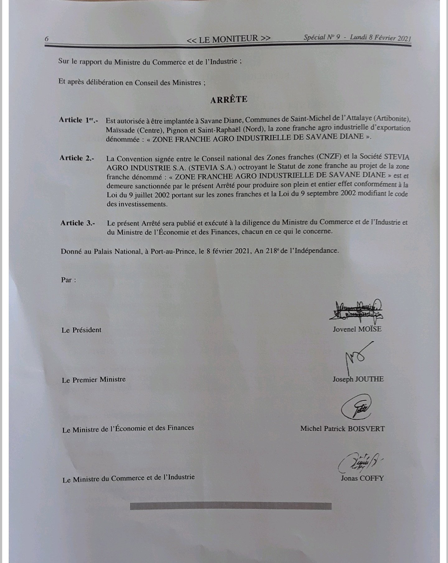 Hier soir, un arrêté présidentiel a mis à la retraite trois juges réputés appelés à remplacer le Président de la République, entraînant des dénonciations d’une dictature en cours de réalisation. Accompagnant cet arrêté sommaire, un autre possiblement plus inquiétant ne semble guère pourtant retenir l’attention: l’autorisation d’implantation à Savane Diane d’une nouvelle zone franche agroindustrielle d’exportation.