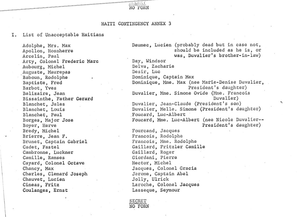 Les autres noms de la liste nous donnent une assez bonne idée de ce que la CIA perçoit comme le cercle de confiance du Dictateur: Mme Max Adolphe, Honsherre Apollon, Paul Arcelin, Colonel Frédéric Marc Arty, Michel Aubourg, Maurepas Auguste, Rodolphe Baboun, Fred Baptiste, Yves Barbot, Jean Bélizaire, Père Gérard Bissainthe, Major Joe Borge, Hervé Boyer, Michel Bredy, Jean F. Brierre, Captaine Gabriel Brunet, Fastel Cadet, Lucner Cambronne, Ramses Camille, Colonel Octave Cayard, Max Chancy, Clemard Joseph Charles, Lucien Chauvet, Fritz Cineas, Ernst Coulanges, Lucien Daumec, Windsor Day, Zacharie delva, Luc Désir, Capitaine Max Dominique, Mme Max Dominique (née Marie-Denise Duvalier), Mme Simone Ovide Duvalier (Mme François Duvalier), Jean-Claude Duvalier, Mlle Simone Duvalier, Luc-Albert Foucard, Mme Luc-Albert Foucard (née Nicole Duvalier), Jacques Fourcand, Rodolphe François, Mme Rodolphe François, Fritzler Camille Gaillard, Roger Gaillard, Pierre Giordani, Michel Hector, Colonel Gracia Jacques, Capitaine Abel Jérôme, Ulrick Jolly, Colonel Jacques Laroche, Seymour Lasseque, André Leroy, Elois Maitre, Claude Moïse, Rodolphe Moïse, Major Monod Philippe, Paul Pierre-Antoine, Lt Colonel Luc Pierre-Louis, Rossini Pierre-Louis, Antoine G. Petit, Major Frank Romain, Edris Saint-Amand, Jean Saint-Phard, Mme Tvon Saint-Victor (soeur de Foucard), Yvon Saint Victor, Henri Siclait, Capitaine Harry Tassy, Major Jean Tassy, Clement Viau, Leconce Viaud.