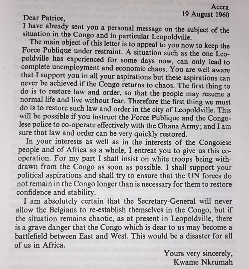 Cette lettre venait en réponse à celle d’un Lumumba furieux du rôle joué par des troupes ghanéennes dans la crise congolaise. À son ami, il expliquait: