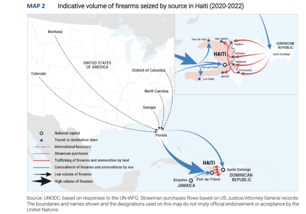 • les États-Unis sont le plus grand fournisseur d’armes légales et illégales à Haïti depuis les années 1980. Depuis 2004, les États-Unis ont fait une large exception à leur embargo de 1991 sur les livraisons d’armes à Haïti ;