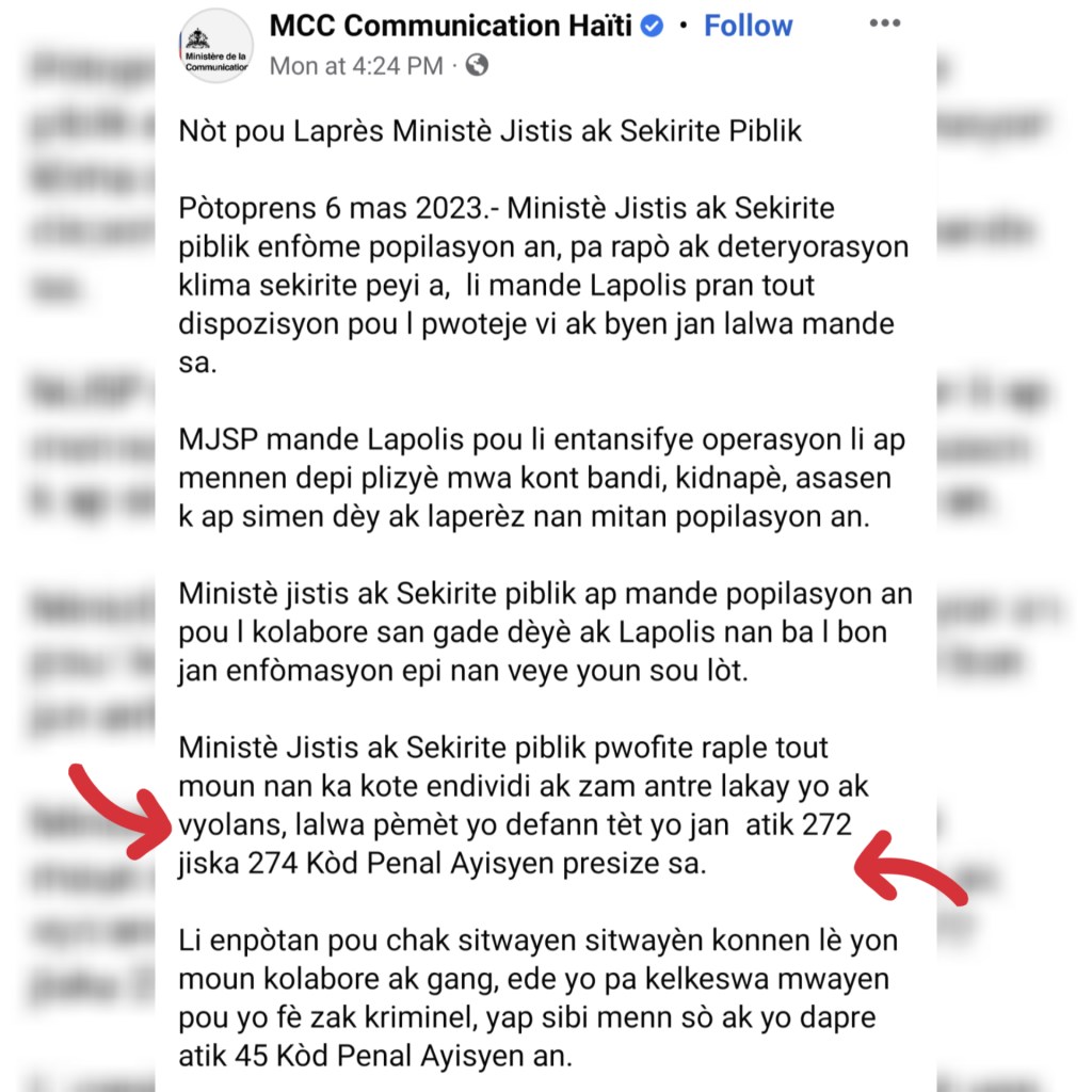 C’est aux articles 272 à 274 du code pénal que nous renvoie la ministre de la justice d’Ariel Henry. Dans un éclair de génie, son ministère rappelle l’existence de la légitime défense à nous pauvres étourdis.es qui l’avions oubliée. Dire que, depuis tout ce temps, il suffisait d’user de ce droit contre ses criminels qui nous terrorisent, nous kidnappent, nous violent, nous tuent, pour mettre fin à cette descente d’Haïti aux enfers. Mais est-ce possible d’être si têtes en l’air !