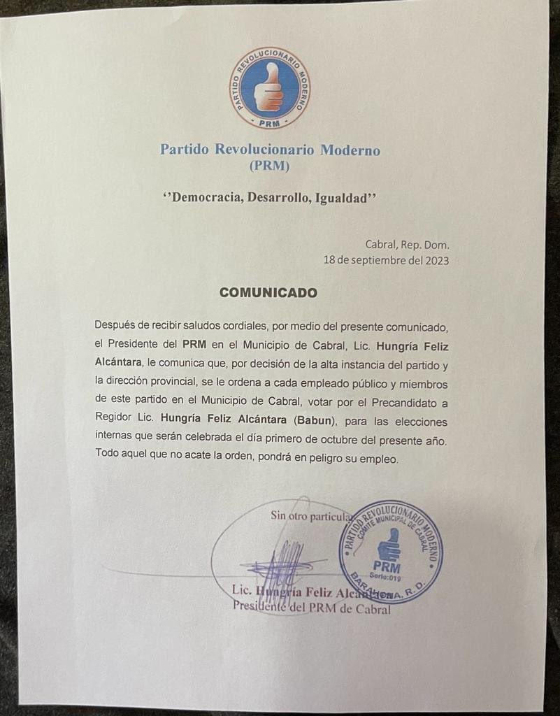 L’île Quisqueya continue de crouler sous le poids de bluffeurs. Aujourd’hui, sur les réseaux sociaux dominicains circule un communiqué qui n’a rien à envier aux meilleurs moments de la dictature des Duvalier. Après s’être elle-même couverte de salutations cordiales, la dame Hungría Feliz Alcántara, présidente du Parti révolutionnaire moderne (PRM) dans la municipalité de Cabral (dans la province du Barahona), informe les destinataires que, « par décision du haut niveau du parti et de la direction provinciale, les employés publics et membres du parti » ont reçu l’ordre de voter comme pré-candidat pour le poste de conseiller, la dame Hungría Feliz Alcánta (Babun) pour les élections internes prévues le 1er octobre de cette année. « Quiconque ne respecte pas cet ordre, écrit-elle, met en péril son emploi ».