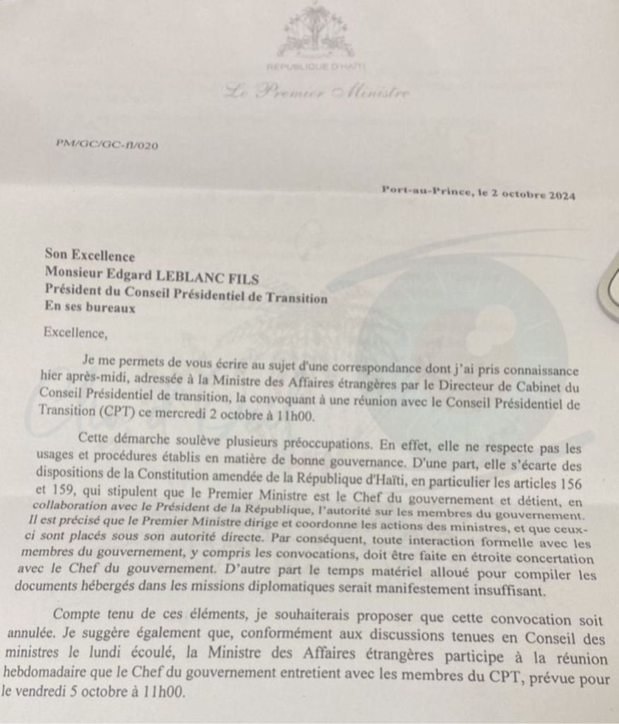 Quelques lecteurs, avides d’éclaircissements, m’ont envoyé une lettre du Premier ministre Conille demandant une annulation de la convocation de la ministre Dupuy, dont je saluais hier soir la rare élégance. Le Dr Conille y soulève des « préoccupations » concernant une convocation qui, selon lui, ne respecte ni « les usages et procédures établis en matière de bonne gouvernance », ni les dispositions de la Constitution amendée, particulièrement les articles 156 et 159, qui définissent le rôle du Premier ministre comme Chef du gouvernement. Il en conclut que la convocation aurait dû passer par lui. Mais, à bien y regarder, l’argument ne tient pas.