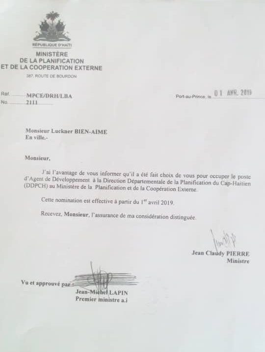 Pour tester son investissement, le député Candy Dorfeuille se serait rendu au Ministère de la Planification et de la Coopération externe pour exiger que le Ministre Pierre Jean Claudy gère l’affaire courante de la nomination de deux nouveaux agents de développement à la direction départementale capoise du Ministère et d’un opérateur informatique à la direction départementale de l’Ouest. Les lettre de nomination, signées par le Ministre Pierre et approuvée par le Premier Ministre Lapin sont reprises ci-dessous.