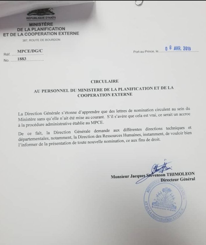 La nouvelle surprend le Directeur Général, Jacques Stevenson Thimoléon, et le Syndicat du Ministère qui, iront aussi de leurs circulaires, pour dénoncer, s’étonner et prendre acte des irrégularités.