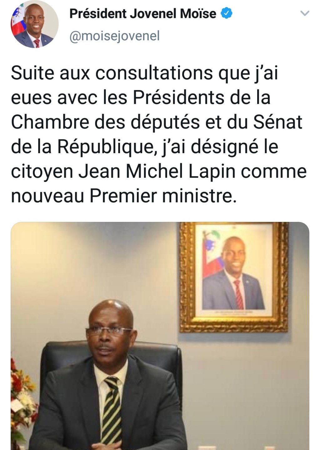 Il y avait des indices pourtant. À commencer par, dans l’affaire des Mercenaires, la présence du Ministre Jean-Michel Lapin au Commissariat de Port-au-Prince bien avant l’arrivée du Commissaire. Pour une affaire concernant de si près le Président et les siens, la présence de Lapin ne pouvait être fortuite. L’homme a la confiance de son chef qui d’ailleurs n’hésite pas à le montrer dans le Tweet même nous informant de sa nomination comme Premier Ministre.